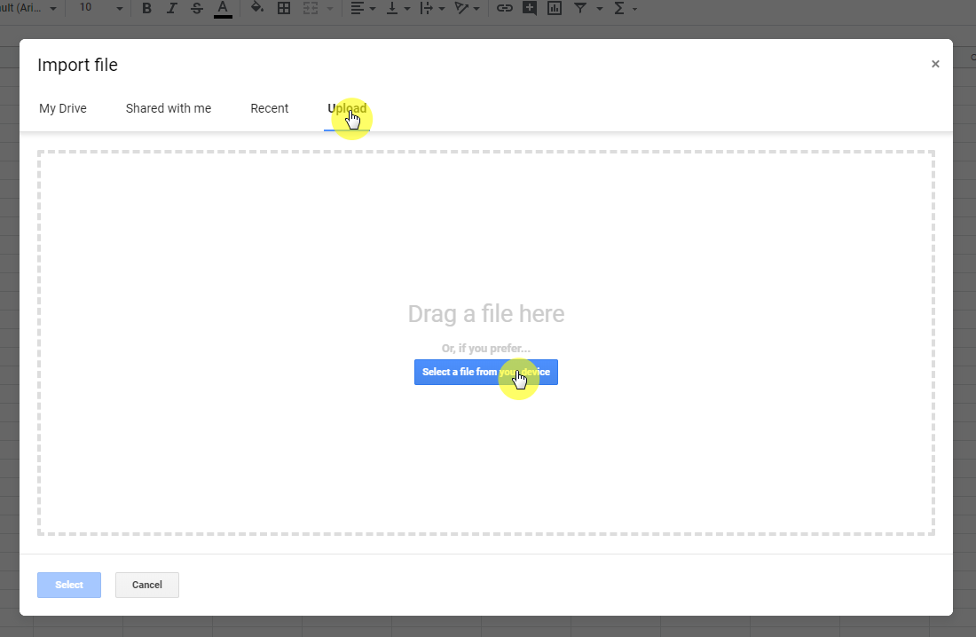 4. Then click File -> Open. On the Upload tab of the Import File screen, either drag-and-drop the file in the space provided, or click Select a file from your device to choose the PackingBagLabelCsvTemplate.csv file you downloaded.