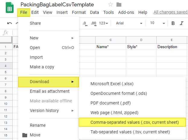 6. When you are finished filling out your spreadsheet, click File ->Download->Comma-separated values (.csv, current sheet).